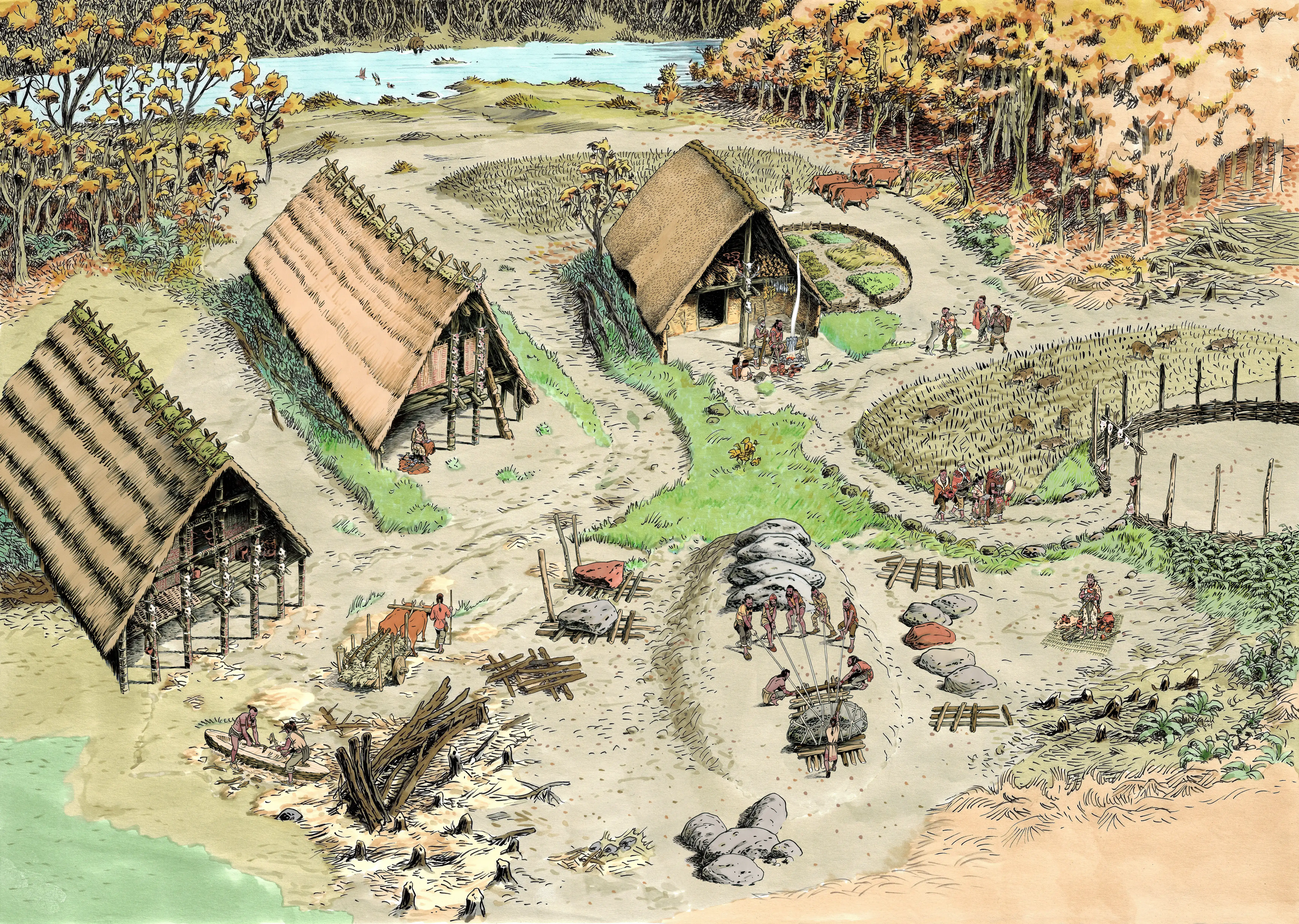 Veeg, scroll en zoom door de vensterplaat om een beeld te krijgen van hoe we leefden in de periode van de steentijd die we de Trechterbekercultuur noemen, en tik of klik op de onderdelen om meer te ontdekken.